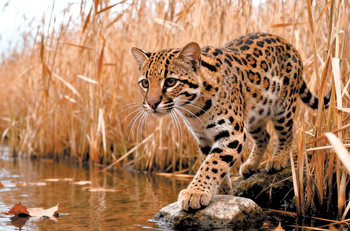 据夏乡介绍,当时他正在拍摄川河湿地的鸟类,突然发现灌木丛间窜出一只小型猫科动物,它警觉地环顾四周后,沿河岸草丛敏捷移动,时而俯身觅食,时而驻足观察,就趁机记录下这一珍贵瞬间。该动物体形与家猫相仿但更为纤细,四肢矫健,身上醒目的圆形斑点酷似铜钱,正是俗称“钱猫”的豹猫。